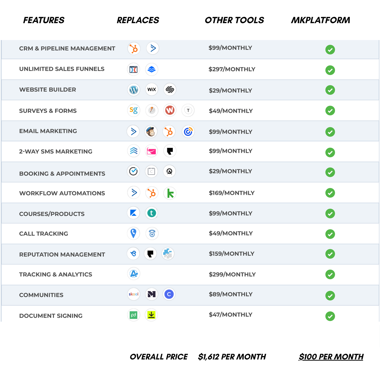 Why pay over $1,600/month for a patchwork of tools, when you can run your entire business with MKPlatform for just $100/month?